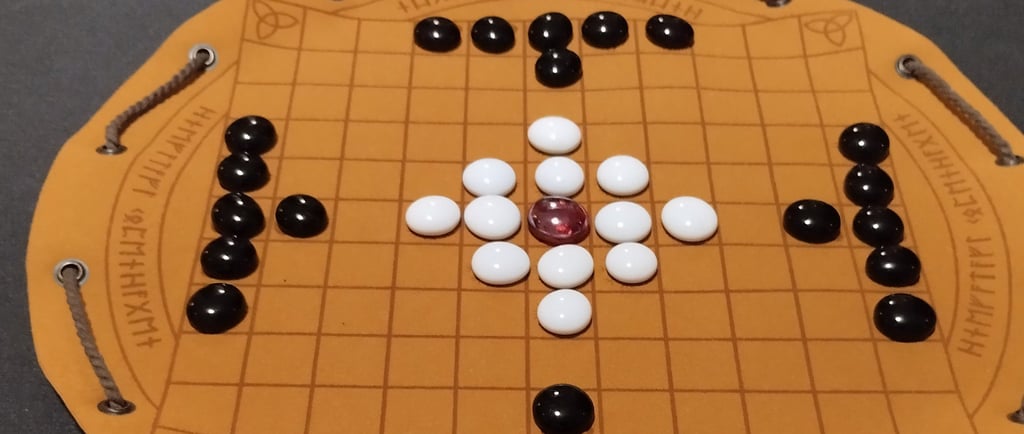 The gameplay of Hnefatafl is simple yet strategic. All pieces move like the rook in chess, meaning they can move horizontally or vertically any number of squares. Pieces are taken by "sandwiching," which involves moving your piece so that an opponent's piece is trapped horizontally or vertically between two of yours.
